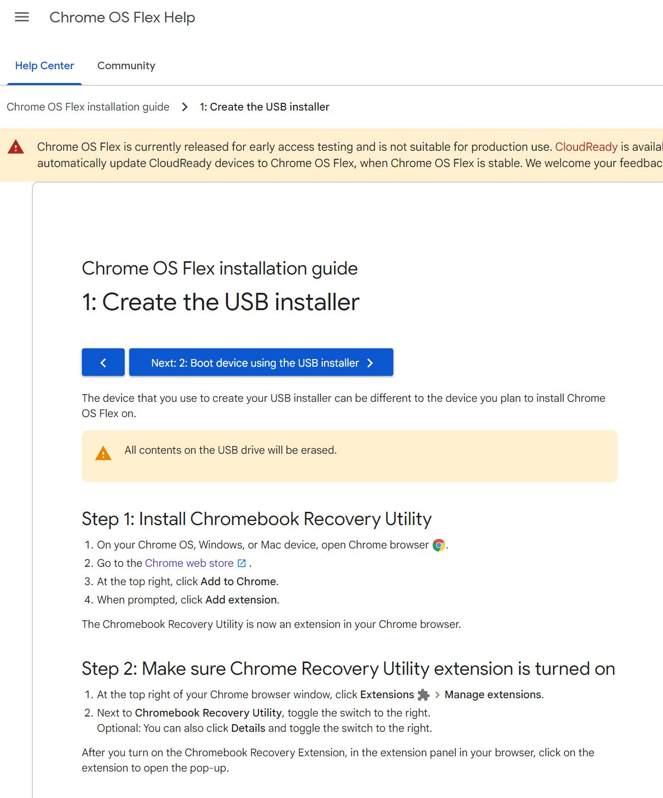 Als je Chrome OS Flex wilt installeren, zorg je voor een lege usb-stick met een capaciteit van minimaal 8 GB. Download Chrome OS Flex via hier. Hier vind je meteen ook een stappenplan met instructies voor de installatie. Met de gemaakte usb-stick hoef je overigens niet per se een installatie uit te voeren. Je kunt de stick ook gebruiken in de live-modus. Hierbij start je de computer op en kun je Chrome OS Flex uitvoeren zonder een daadwerkelijke installatie.