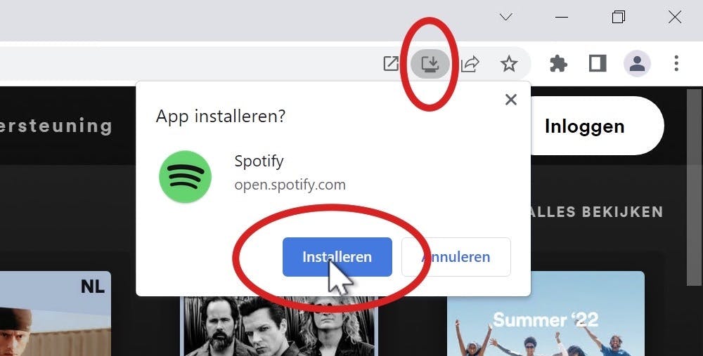 Zoals beloofd kun je met Chromium ook PWA’s installeren. Handig, want daarmee geef je je Windows-pc of notebook de essentiële vaardigheden van een Chromebook. Zoek een PWA, bijvoorbeeld de Spotify web-player. Als je goed aan de rechterkant van de adresbalk kijkt, zie je daar een installatieknopje. Klik hierop en dan op de knop Installeren.