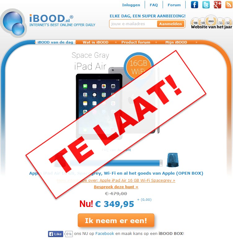 De iBood Hunt gaat maar door deze keer en ze blijven dan ook komen, de strakke aanbiedingen. Rond middernacht zien we een iPad Air langsflitsen voor €349,95. Tegen de tijd dat u dit leest is die hoogstwaarschijnlijk allang uitverkocht. Maar blijf kijken en vooral hopen, wie weet welke gruwelijk mooie hebbedingen, statussymbolen en andere mooie zaken er nog voorbijkomen. U hebt tot middernacht de tijd en gezien de vele iBood-addicts die er hun nachtrust voor opgeven kunnen we stellen dat de befaamde Hunt behoorlijk verslavend is. Kan uw arme hart niet tegen al deze hoogspanning, kijk dan ook even naar de vaste aanbieding van de dag: een iPad 4 met 64 GB opslagruimte voor €449,95. Daarop hebt u flink wat ruimte voor apps, muziek, films en documenten en alles ziet er gestoken scherp uit op het Retina-beeldscherm.
