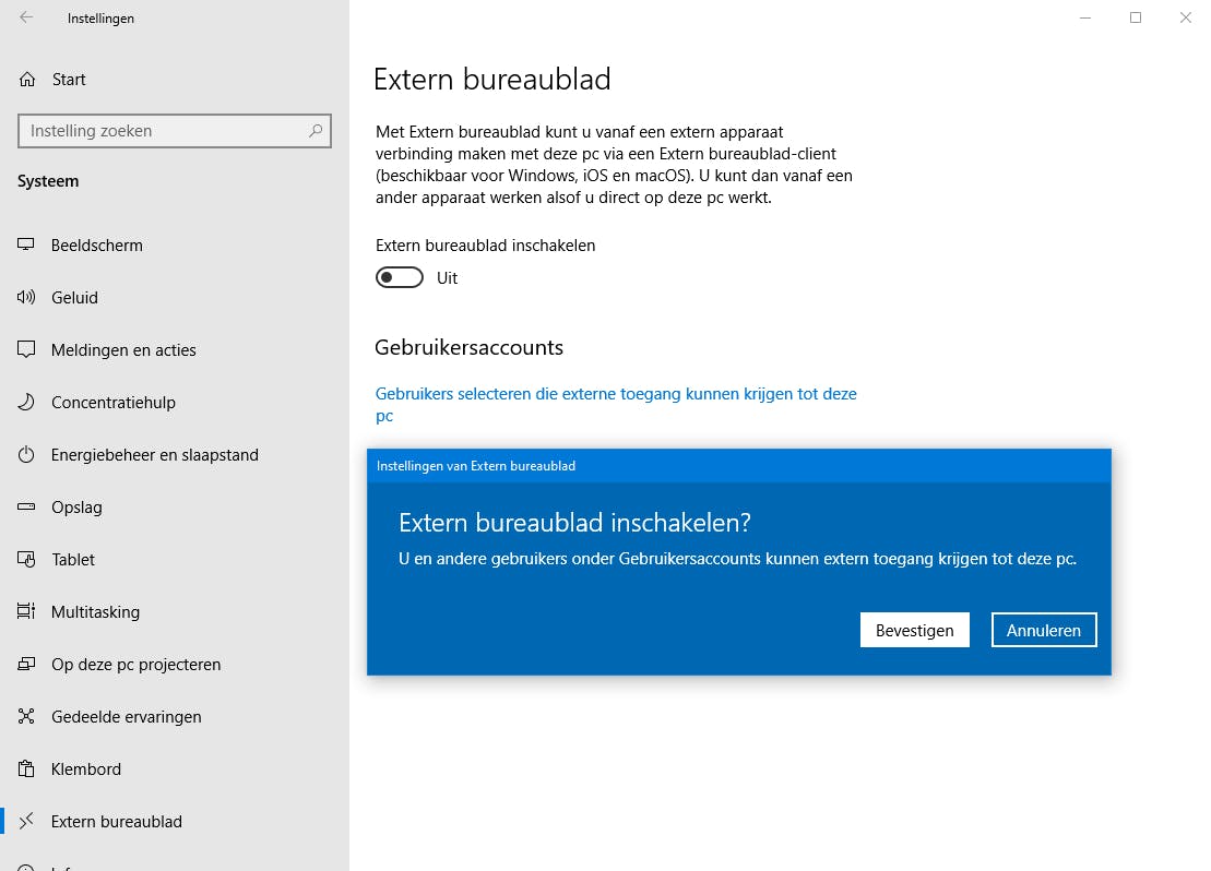 Heb je Windows Pro, dan hoef je voor een potje ‘computeren op afstand’ niet eens te gaan shoppen: er zit namelijk in een functie ingebouwd waarmee dat mogelijk wordt. Om je pc te laten overnemen, open je hiervoor Instellingen in Windows en kies je Systeem / Extern bureaublad. Schakel de functie in en klik vervolgens op Gebruikers selecteren die externe toegang kunnen krijgen tot deze pc. Via de knop Toevoegen selecteer je de accounts die je pc op afstand mogen benaderen.