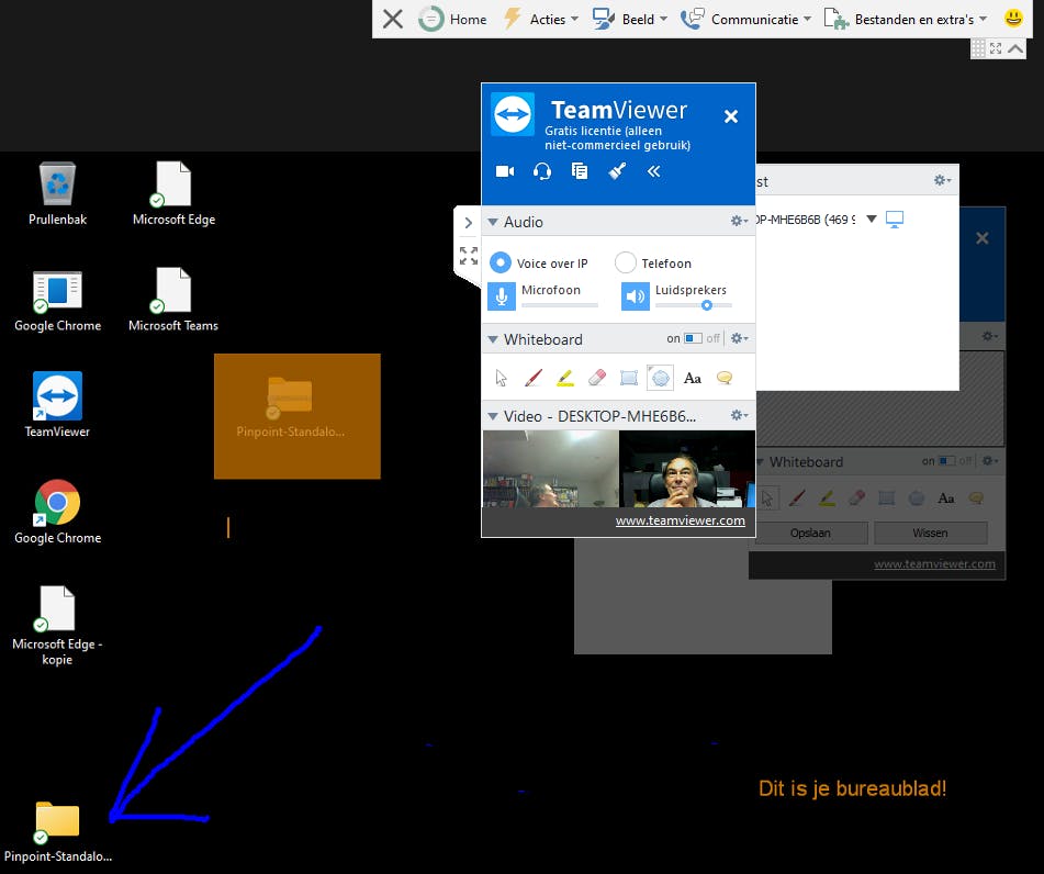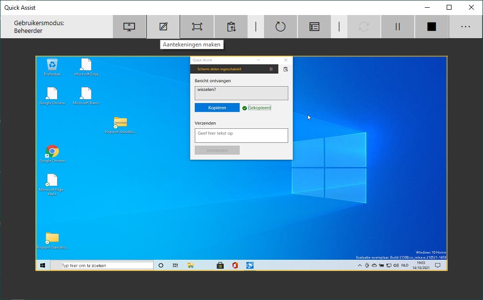 Hij klikt vervolgens op Scherm delen, waarna op het scherm van de hulpverlener de keuze verschijnt tussen Volledig beheer en Scherm bekijken. In het eerste geval kan hij de pc van de kennis daadwerkelijk overnemen en op afstand besturen. Nadat de kennis op de knop Toestaan drukt, krijgt de hulpverlener het beeldscherm van de andere partij te zien. In een knoppenbalk vindt hij tools als Aantekeningen maken en Beeldscherm selecteren (als er meerdere schermen zijn). Beide partijen kunnen de verbinding op elk moment onderbreken.