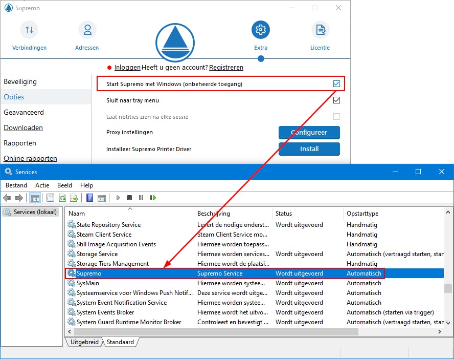 Vervolgens ga je naar Opties, waar je een vinkje zet bij Start Supremo met Windows (onbeheerde toegang). Bevestig met Opslaan. Je controleert dan of de Supremo-service wel degelijk actief is: druk op Windows-toets+R en voer services.msc uit: Supremo hoort erbij te zitten.