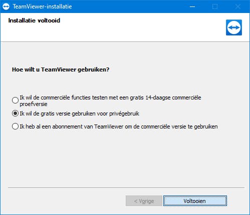 Druk op Volgende om de installatie van start te laten gaan. Na afloop selecteer je Ik wil de gratis versie gebruiken voor privégebruik – tenzij je ook interesse hebt in enkele commerciële functies en de 14-daagse proefversie liever gebruikt. Rond af met Voltooien.