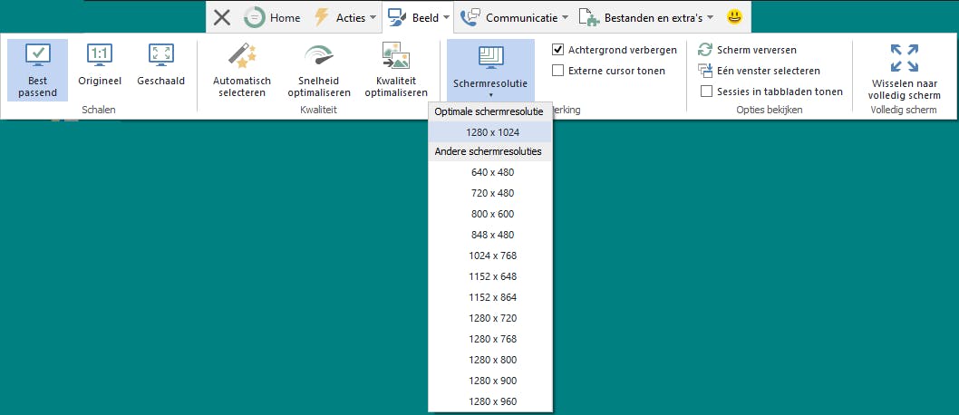 Na je bevestiging met Aanmelden verschijnt het bureaublad van de ander op je scherm, eventueel nadat die eerst zijn fiat heeft gegeven. Aan de knoppenbalk bovenaan merk je duidelijk dat TeamViewer meer mogelijkheden biedt dan Supremo. Zo bevat de knop Beeld verschillende opties om de beeldweergave aan te passen en te optimaliseren.