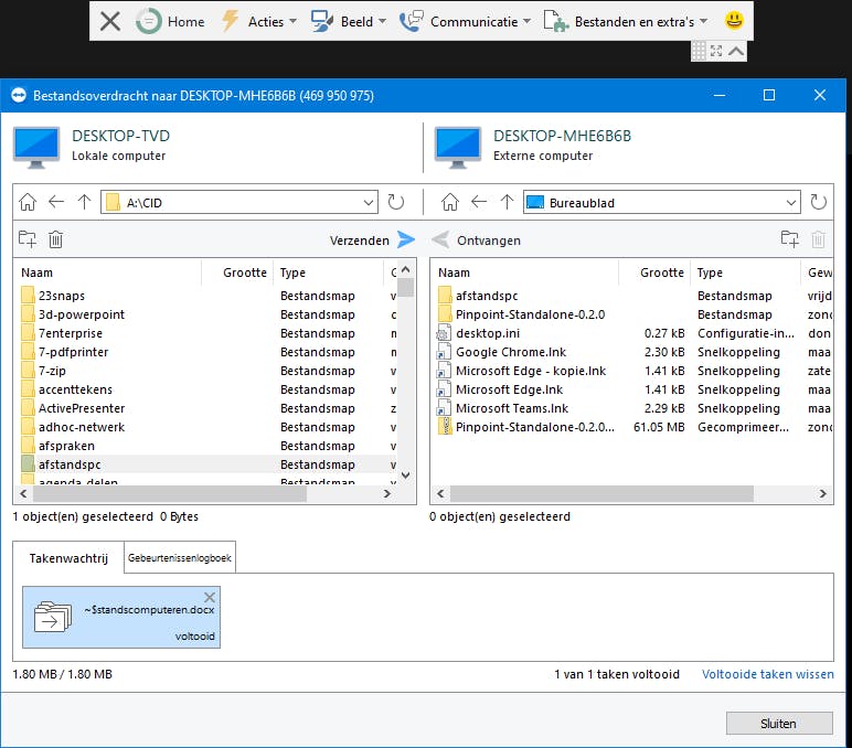 TeamViewer laat zich ook gewillig inzetten om snel bestanden tussen twee pc’s uit te wisselen. Dat kon weliswaar door bij het opzetten van een verbinding de optie Bestandsoverdracht te selecteren, maar het kan ook wanneer je voor Afstandsbediening had gekozen (zie ook de paragraaf ‘Machtigingen’), vanuit de rubriek Bestanden en extra’s.