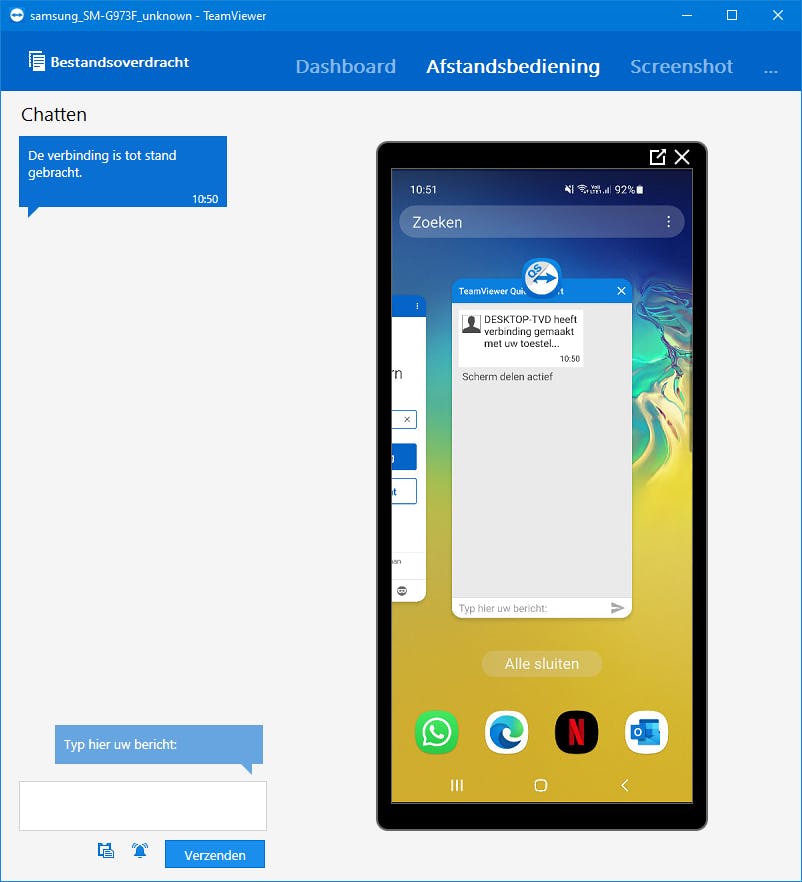 Ook de omgekeerde richting is mogelijk. Selecteer hiervoor Open QuickSupport en verleen de gevraagde machtigingen aan QuickSupport. De apparaat-ID verschijnt en op een desktop-pc hoeft iemand nu maar te surfen naar https://start.teamviewer.com en de ID in te vullen. Zodra die dan op Verbinding maken met Partner / TeamViewer openen klikt en de smartphone-gebruiker zijn toestemming heeft gegeven, krijgt hij het scherm van de smartphone op de pc te zien en kan hij het apparaat op afstand bedienen.