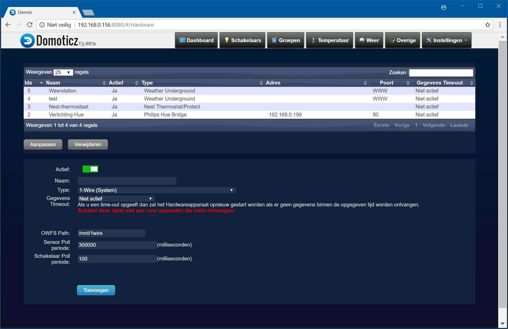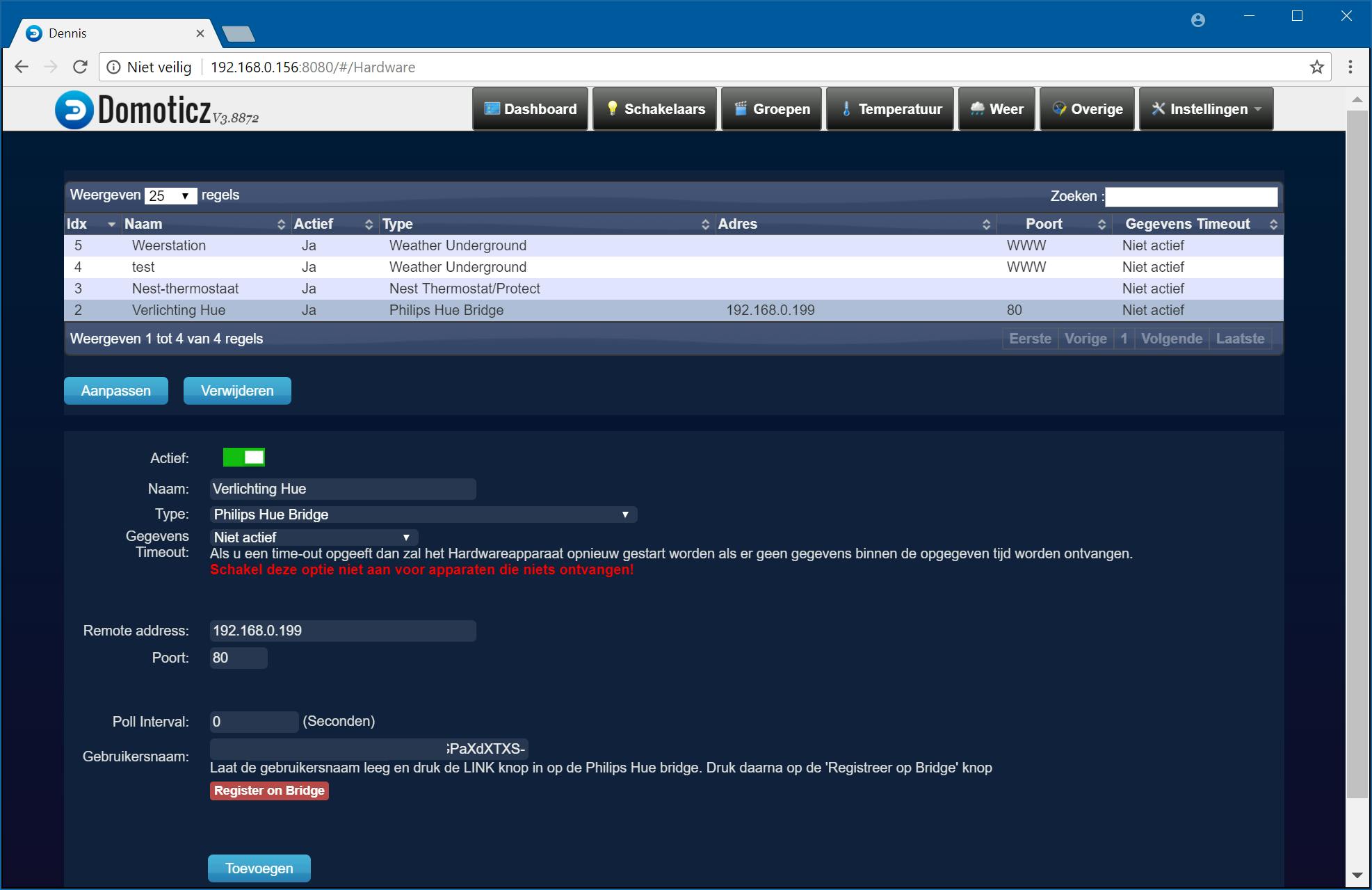 Klik in het beginscherm op Hardware. Hier geef je aan welke apparaten zoals bridges en gateways er in jouw woning aanwezig zijn. Kies in de lijst bij Type het apparaat dat je wilt toevoegen, bijvoorbeeld Philips Hue Bridge. De lijst bevat een groot aantal apparaten, waaronder de bekende Toon-thermostaat, Nest-thermostaat, Philips Hue en Logitech Harmony. Sommige apparaten kun je relatief eenvoudig toevoegen, zoals de Hue Bridge. Geef het ip-adres en de poort op, en druk op de ronde link-knop op de Hue-bridge zelf. In Domoticz klik je direct daarna Register on Bridge. De koppeling wordt dan automatisch gemaakt en je hoeft geen gebruikersnaam en wachtwoord meer op te geven. Zijn alle gegevens ingevuld, dan voeg je het apparaat toe via Toevoegen. Het apparaat wordt toegevoegd aan de hardwarelijst.