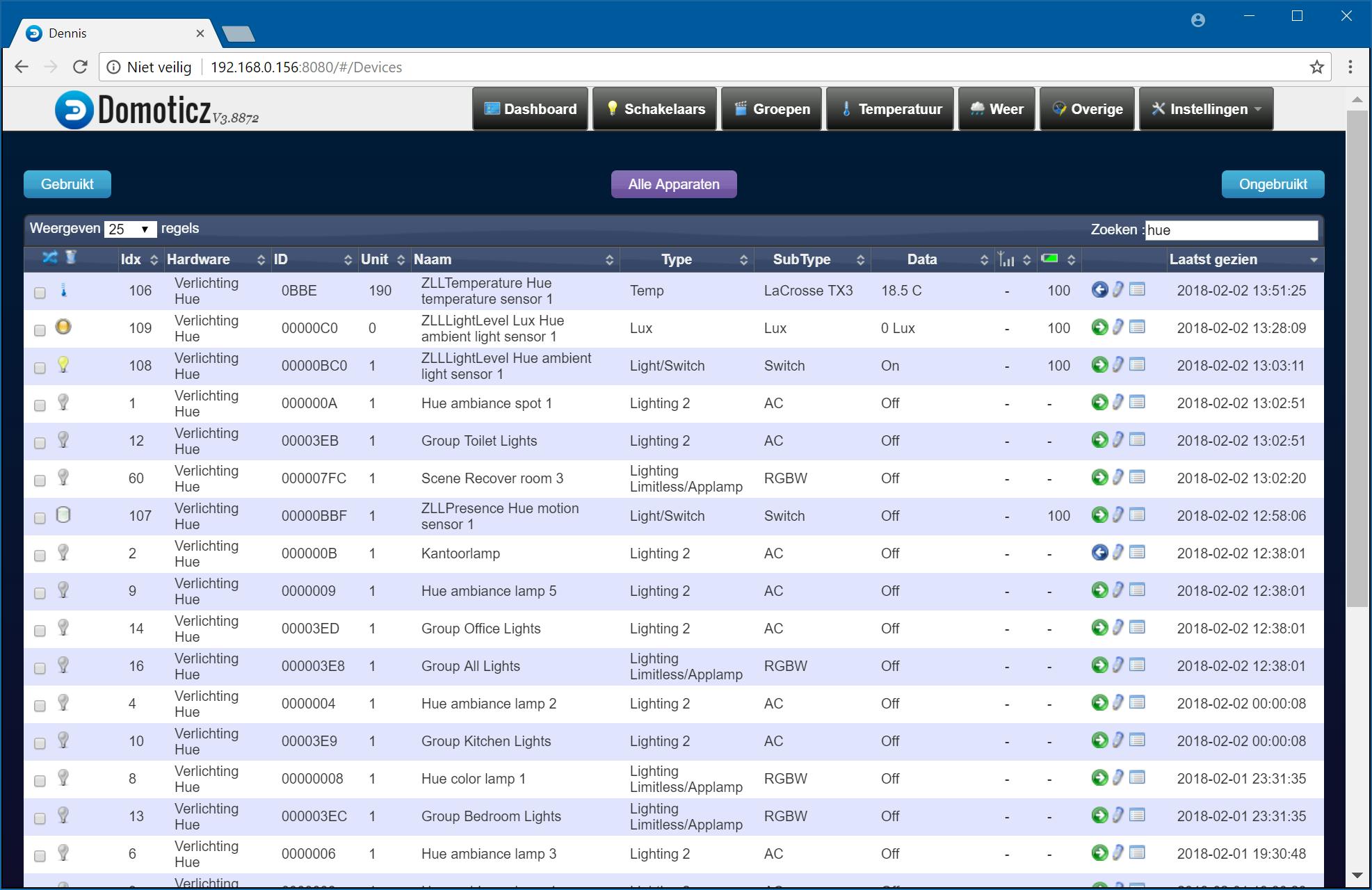 Als je de onderdelen zoals de Hue Bridge hebt toegevoegd, vind je de bijbehorende apparaten (zoals de eigenlijke lampen) via Instellingen / Apparaten. Deze tabel bevat interessante informatie over de verschillende apparaten en hun status. Heb je bijvoorbeeld de Toon-thermostaat of Nest-thermostaat toegevoegd, dan zie je hier de actuele temperatuurinstellingen. Ook ‘verborgen’ informatie is hier zichtbaar, zo bevat de bewegingsmelder van Philips Hue ook een thermometer, en ook die gegevens worden hier getoond. Deze tabel geeft je dus de ‘bouwblokken’ van je slimme woning.
