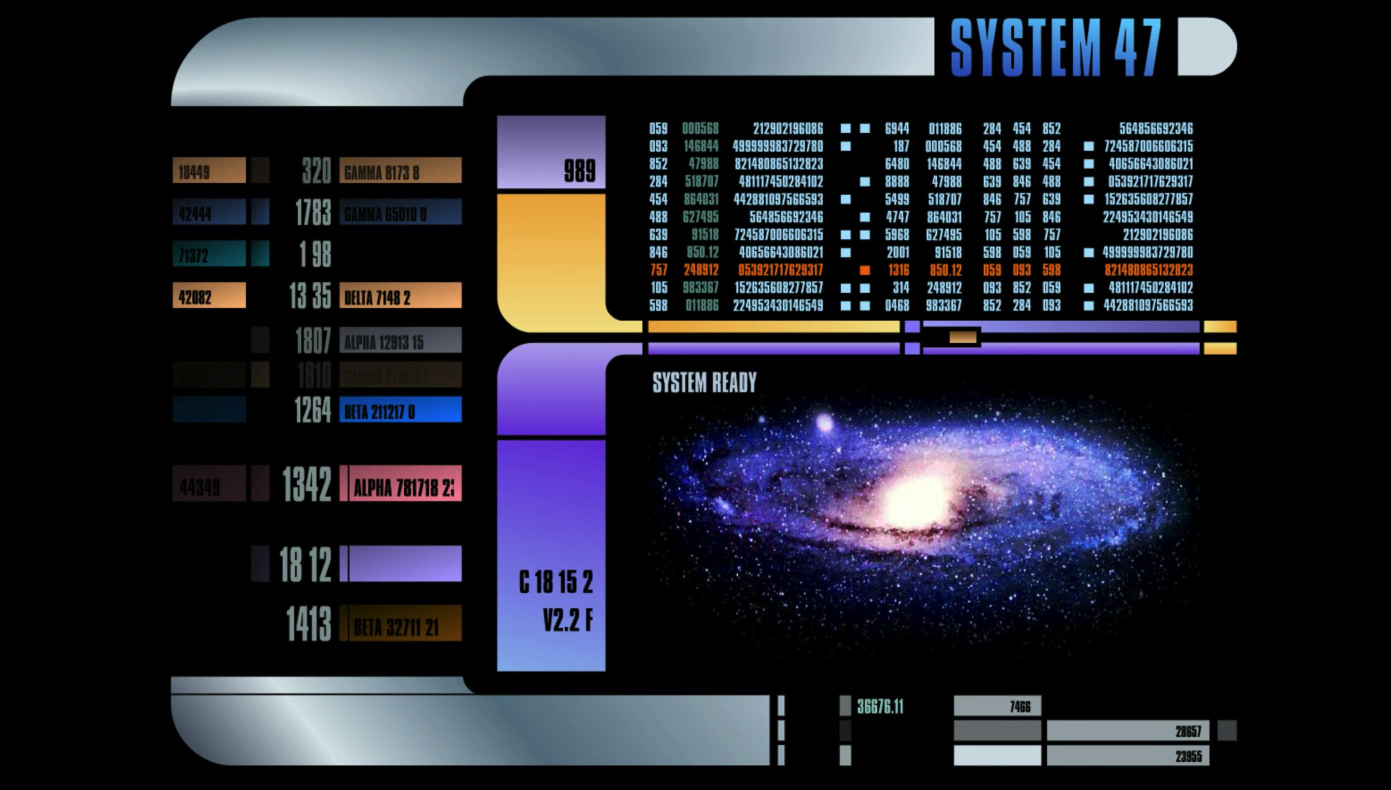 Op close-upfoto’s van de Star Trek-programma’s en -films kun je het woord LCARS op de computerschermen lezen. LCARS is het acroniem voor Library Computer Access and Retrieval System, het computersysteem in het universum van Star Treks Starfleet en Federation. Met System 47 lijkt het alsof je aan de knoppen zit in de scifi-reeks. Iets voor Trekkies dus. Acht animatiereeksen telt de screensaver, waaronder een Sector Scan, Star System Analysis, Milky Way Galaxy Map en meer …