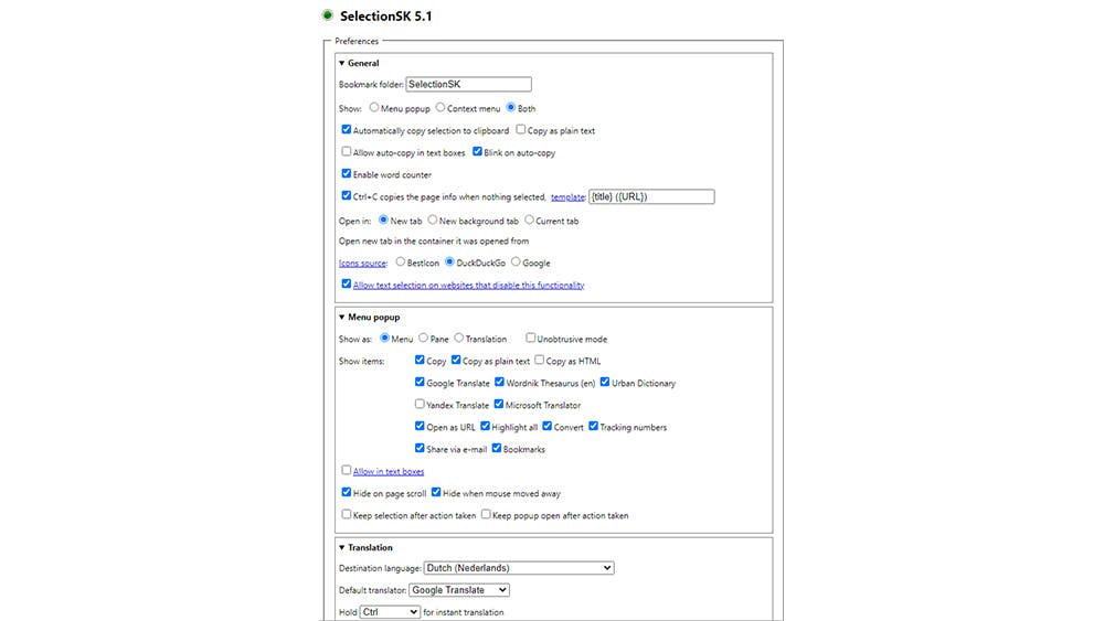 Er zijn heel wat nuttige webservices en SelectionSK brengt binnen Chromium of Firefox diverse diensten mooi samen in één menu. Het volstaat om een stukje tekst met de muis te markeren om een pop-menu te zien. De gemarkeerde tekst kun je van hieruit naar het klembord sturen, in een nieuwe e-mailbericht plaatsen of doorsturen naar allerlei onlineverstaaldiensten en woordenboeken.