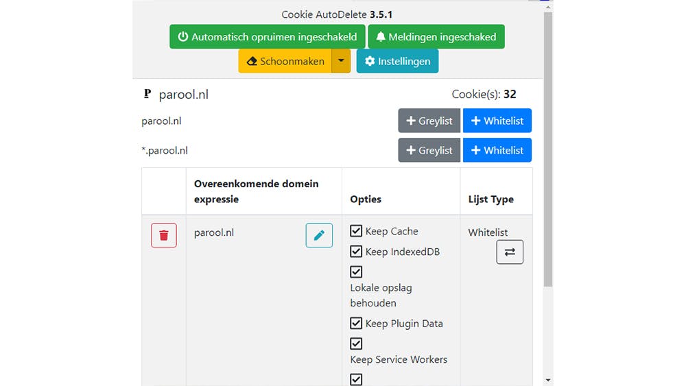 Wil je cookies en aanverwante data nauwgezet aansturen, probeer dan Cookie AutoDelete eens. Je doet er wel goed aan na de installatie de instellingen te doorlopen. Onder meer de rubriek Automatisch opruimen opties is best interessant.