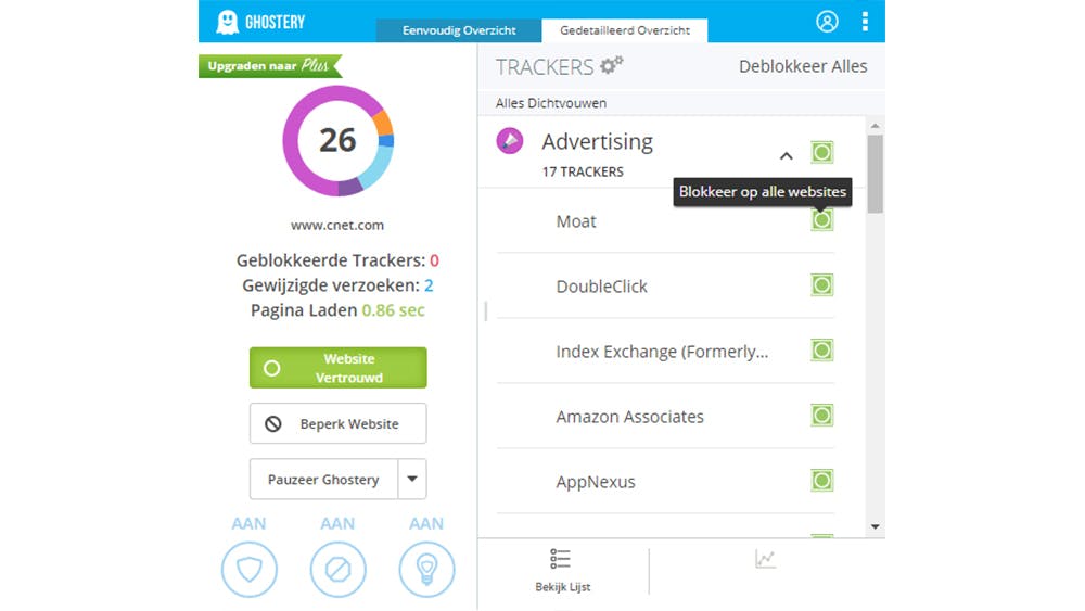 Ghostery is een openbrontool die advertenties, trackers en allerlei andere inhoud van derde partijen blokkeert. Een tellertje op het icoon vertelt je hoeveel trackers en aanverwanten de tool op de huidige webpagina heeft aangetroffen.