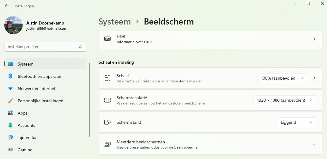 In principe staat je beeldscherm automatisch al op de meest optimale resolutie, maar het kan geen kwaad om dit toch nog even te controleren. Ga daarvoor in Windows 11 naar de Instellingen-app en in het Systeem-menu vind je de optie Beeldscherm. Klik daarop en je krijgt direct meer informatie over je monitor. Onder Schaal en indeling vind je de optie Schermresolutie. Als het goed is, zie je achter de schermresolutie tussen haakjes aanbevolen staan. Je weet dan dat je op het gebied van schermresolutie de beste instellingen hebt gekozen.