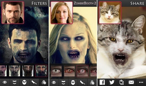 Om eruit te zien als een echte zombie moet je veel tijd en moeite doen, maar dankzij ZombieBooth 2 verander jij in no time in een levensechte zombie. Je kunt van iedereen, zelfs je huisdier, een griezelige zombie maken. Maak een foto van jezelf, vrienden, familie of wie dan ook, gebruik de zombificeer functie op de app en voilà. Er zijn veel verschillende opties mogelijk, zo ziet elke zombie er weer anders uit.