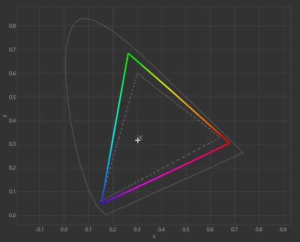 De kleurmetingen laten direct zien dat we niet met een gemiddelde gamemonitor te maken hebben. Het kleurenspectrum overlapt met 99,3 procent van het sRGB-spectrum en 96,6 procent van het DCI P3-spectrum. Hoewel er helaas geen sRGB- of DCI P3-profiel is ingebakken in de monitor, is het met een kalibratie dus wel mogelijk om sRGB en DCI P3 uitstekend weer te geven.