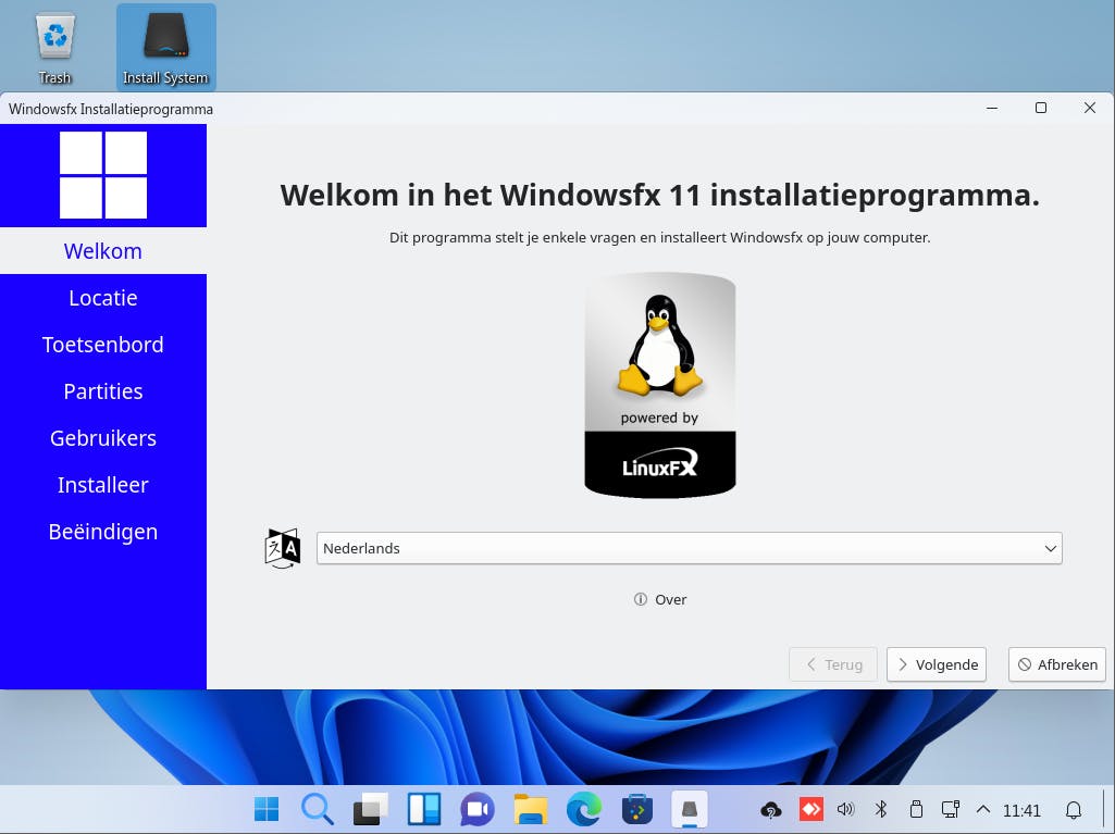 Op het bureaublad vind je het pictogram Install system. Dubbelklik hierop. Het installatieprogramma wordt geopend. In het eerste venster kies je de gewenste taal. Onder meer Nederlands en Engels worden ondersteund. Hoewel de Nederlandse vertaling op het moment van schrijven relatief uitgebreid is, zijn helaas nog niet alle onderdelen vertaald. In de door ons bekeken versie is het verderop besproken instellingenvenster bijvoorbeeld nog alleen beschikbaar in de Engelse taal.