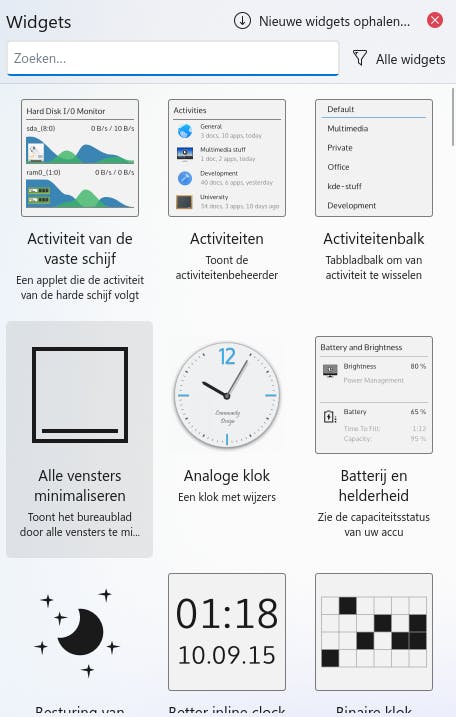 Er zijn verschillende widgets beschikbaar. Enkele springen er wat betreft nut tussenuit. Zo geeft Activiteit van de vaste schijf gedetailleerd weer hoe de harde schijf wordt ingezet. Ook interessant zijn de widgets Activiteiten en Activiteitenbalk. Je ziet hiermee in één keer weke processen actief zijn en hebt daardoor meer controle over het bronnengebruik van het besturingssysteem. Voeg ook Geheugengebruik toe, zodat je in de gaten kunt houden hoeveel geheugen door de machine wordt gebruikt.
