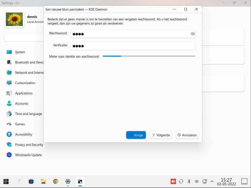 Over beveiliging gesproken: in Windowsfx vinden we een ingebouwde bestandskluis. Bestanden die je hierin bewaart, worden aanvullend versleuteld. De kluis integreert goed met de rest van het besturingssysteem, waardoor deze in de praktijk erg nuttig is. In de taakbalk bij de klok, klik je op de knop Verborgen pictogrammen weergeven. Je herkent de knop aan het opstaande pijltje (^). Kies vervolgens voor Kluizen en klik op Een nieuwe kluis aanmaken.