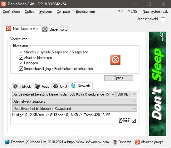 Als je Don’t Sleep hebt geïnstalleerd en gestart, dan zie je direct de twee belangrijkste tabbladen: Niet slapen s.v.p. en Slapen s.v.p.. Met op eerstgenoemde tabblad de opties om te voorkomen dat de pc in slaap valt. Je kunt hier instellen welke ‘uitzetopties’ geblokkeerd dienen te worden; van slaapstand tot en met schermbeveiliging.