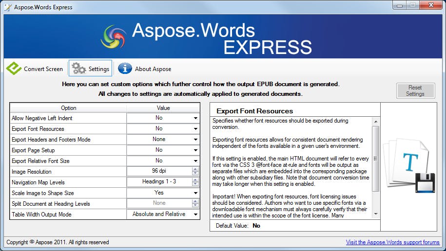 Er zijn natuurlijk ook (gratis) desktoptools waarmee u e-book-conversies kunt uitvoeren. Een bekend multiplatform-programma is bijvoorbeeld Calibre (calibre-ebook.com). Een lichtvoetiger alternatief is Aspose.Words Express (www.aspose.com/categories/free-utilities-and-components.aspx). De bediening kan nauwelijks eenvoudiger: verwijs naar uw brondocument (doc, docx, html, odt, enzovoorts), geef aan waar u het epub-bestand wilt en druk op Convert. Via Settings kunt u nog een en ander bijsturen.