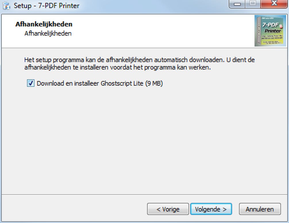 Eerst installeert u een gratis tool als 7-PDF Printer (www.7-pdf.de/7-pdf-printer/pdf-creator/#c1154). Start het uitgepakte installatiebestand op en druk enkele keren op Volgende. Zorg dat er een vinkje staat bij Download en installeer Ghostscript Lite; die module hebt u namelijk nodig. Rond de procedure af met de knop Installeren en met Voltooien. U zult merken dat Windows er nu een – virtuele! – printer bij heeft: 7-PDF Printer. Die staat bovendien als standaardprinter ingesteld. Is dat u iets te voortvarend? Klik dan uw vertrouwde printer met de rechtermuisknop aan en kies hier Als standaardprinter instellen.