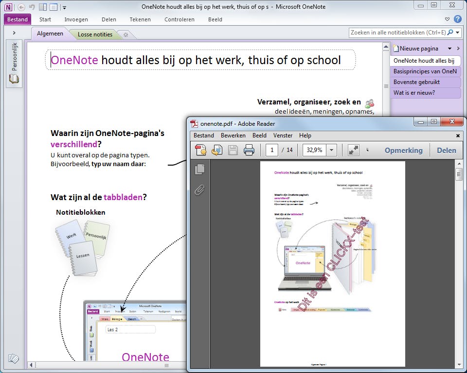 Hoe krijgt u nu een willekeurig bestand omgezet naar pdf? Open het alvast in het bijhorende programma: in ons voorbeeld OneNote, maar er zijn natuurlijk legio tools. Geef de opdracht het betreffende bestand af te drukken. In het afdrukvenster kiest u nu 7-PDF Printer. Die zal u vragen waar u het resultaat – een pdf-bestand dus – wilt opslaan. Loop ook even alle tabbladen langs: zo kunt u bijvoorbeeld de kwaliteit van de afbeeldingen bijsturen of een watermerk toevoegen.