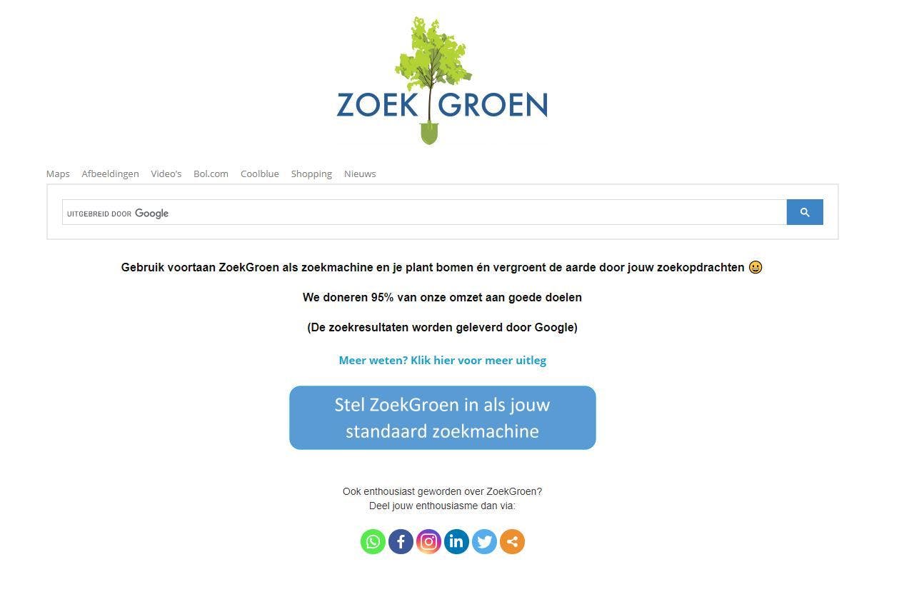Naast Ecosia bestaat er met ZoekGroen nóg een zoekmachine die zijn advertentieopbrengsten gebruikt om nieuwe bomen te planten. Een belangrijk verschil is dat ZoekGroen een beroep doet op de robots van Google. Na invoering van een trefwoord zal de resultatenpagina je dan ook bekend voorkomen.