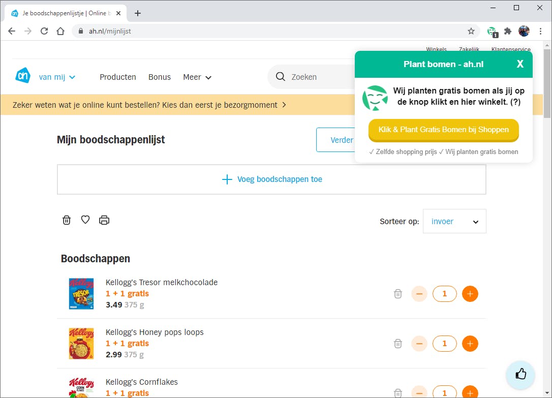 De browserplug-in werkt in combinatie met bijna 45.000 webwinkels, waaronder Amazon.com, MediaMarkt, Bijenkorf en Albert Heijn. Zodra je het digitale winkelwagentje van een webshop opent, verschijnt er een pop-upvenster met een link. Klik hierop en reken vervolgens af om de aanwas van bosrijke gebieden te steunen.