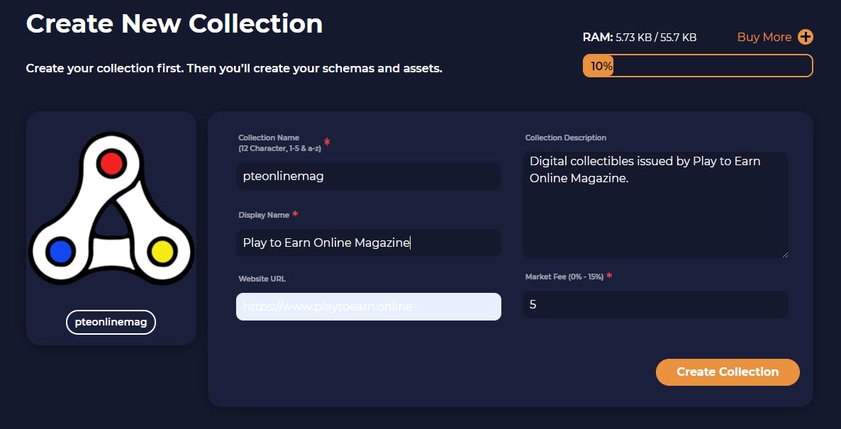 Zodra je op Create Collection klikt, wordt een transactie ingezet. Transacties op de Wax-blockchain zijn doorgaans gratis, behalve wanneer je een zeer intensieve gebruiker bent. Tegen betaling van een paar cent, betaald in WAXP-tokens, kunnen gebruikers meer computerkracht kopen.