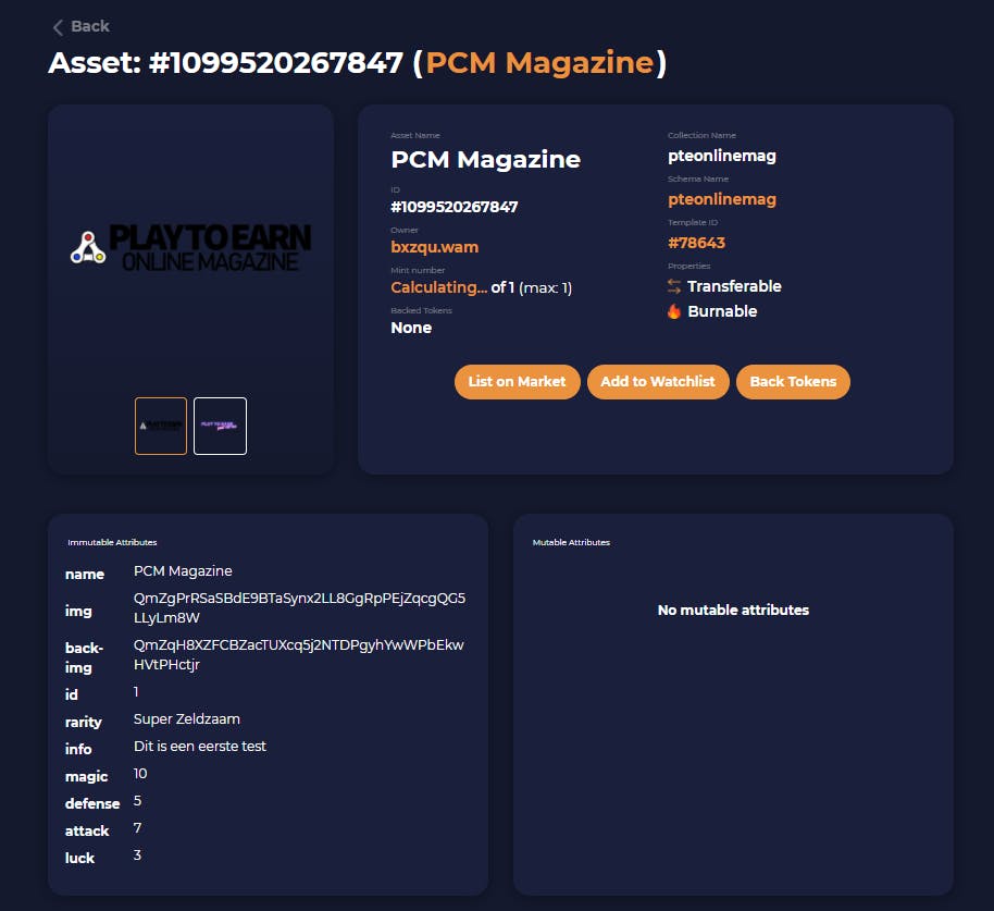 Tot slot gaan we naar Mint New Asset. Op de nieuwe pagina selecteer je de benodigde template uit het dropdown-menu. Vervolgens moet je de resterende informatie invullen. In het voorbeeld wordt een back-img aangemaakt. Deze kan je zelf aanmaken en opslaan op het decentrale web via https://pinata.cloud/, de hash die verwijst naar de afbeelding kopieer je vervolgens bij de juiste attribute.