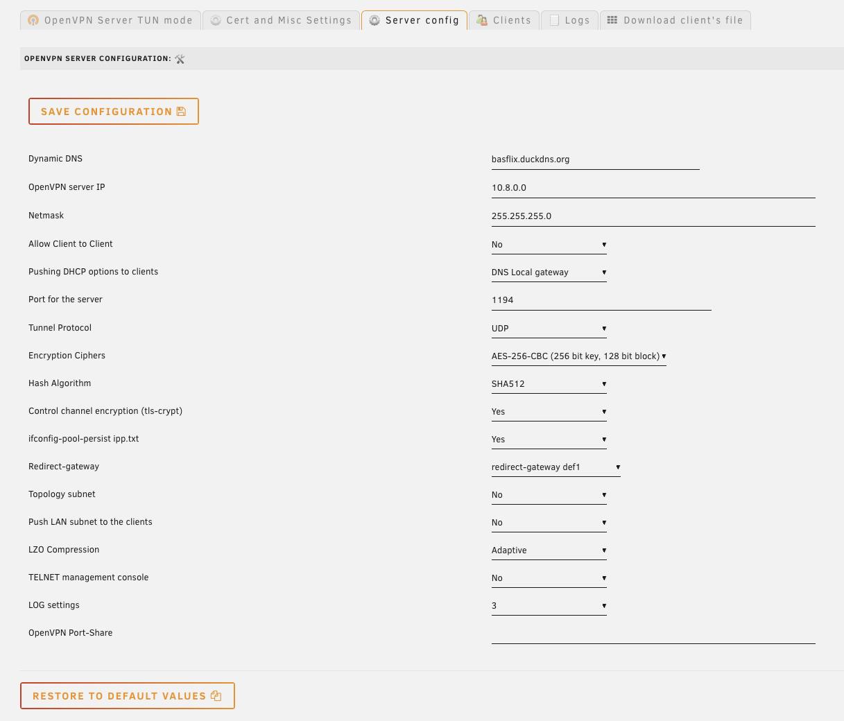 Vervolgens druk je op Generate the Server Certificates and Keys. Hiermee worden de codes gegenereerd waarmee je straks vanaf een telefoon op de vpn-server kunt inloggen. Onder Server config vind je de serverinstellingen, waar je het adres bij OpenVPN server IP moet aanpassen naar je externe ip-adres. Dit adres vind je door een site zoals whatsmyip.org te bezoeken, maar mogelijk verandert je externe adres van tijd tot tijd. Dat is op te lossen door de dns-software DuckDNS te installeren.
