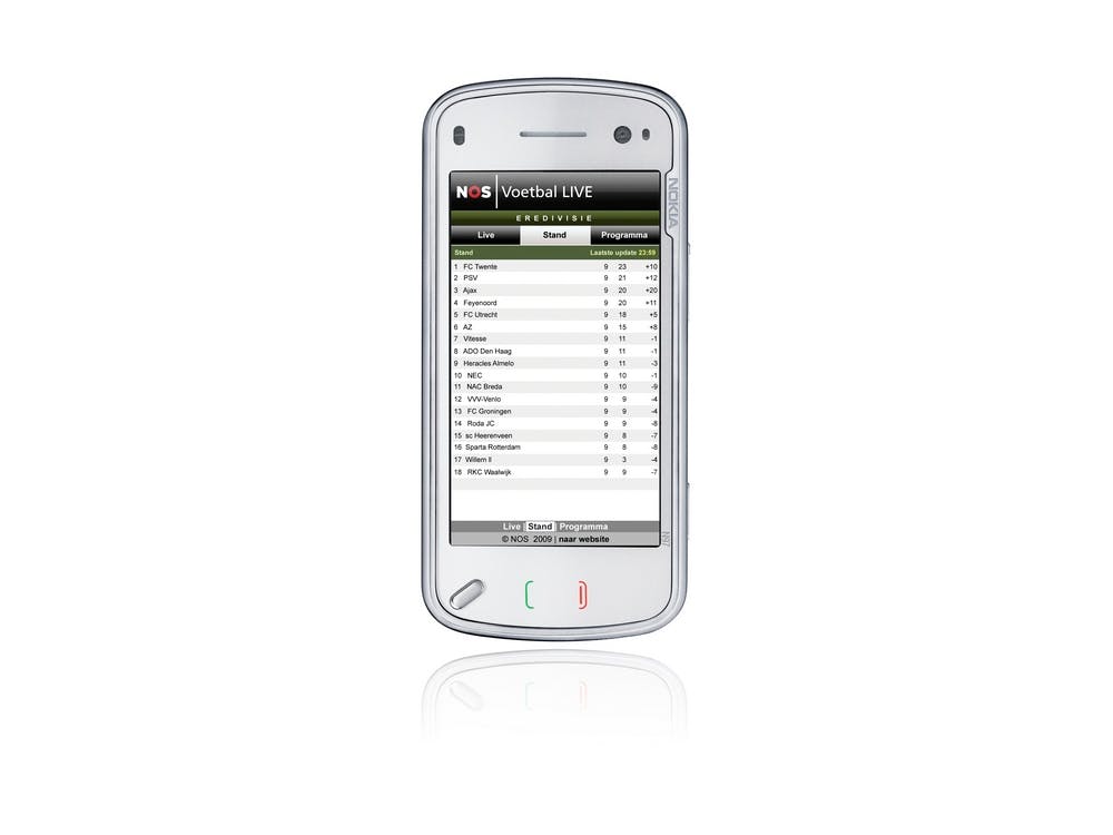 Deze week lanceert de NOS een nieuwe mobiele site met de naam NOS Voetbal LIVE waar op alle laatste informatie over het voetbal in de Eredivisie te vinden is. De site is toepasbaar voor alle mobiele telefoons, die beschikken over internet. NOS Voetbal LIVE biedt de voetballiefhebber altijd en overal de laatste informatie van de Eredivisie tussenstanden in een handig, kort overzicht.