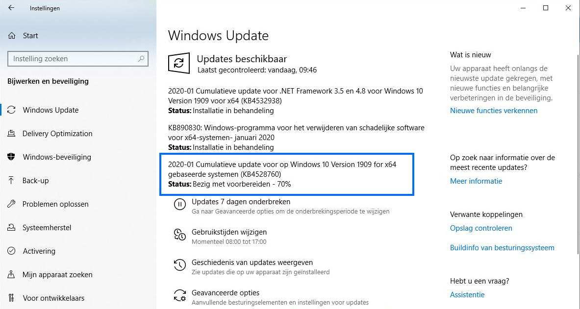 De update die je specifiek nodig hebt, is cumulatieve update KB4528760. Deze is op 13 januari 2020 vrijgegeven. Het kan zijn dat deze al automatisch op je systeem is geïnstalleerd. Dat controleer je als volgt. Ga naar Instellingen, Bijwerken en beveiliging. Klik dan op Geschiedenis van updates weergeven. Je zou de update dan terug moeten zien onder het kopje Kwaliteitsupdates.