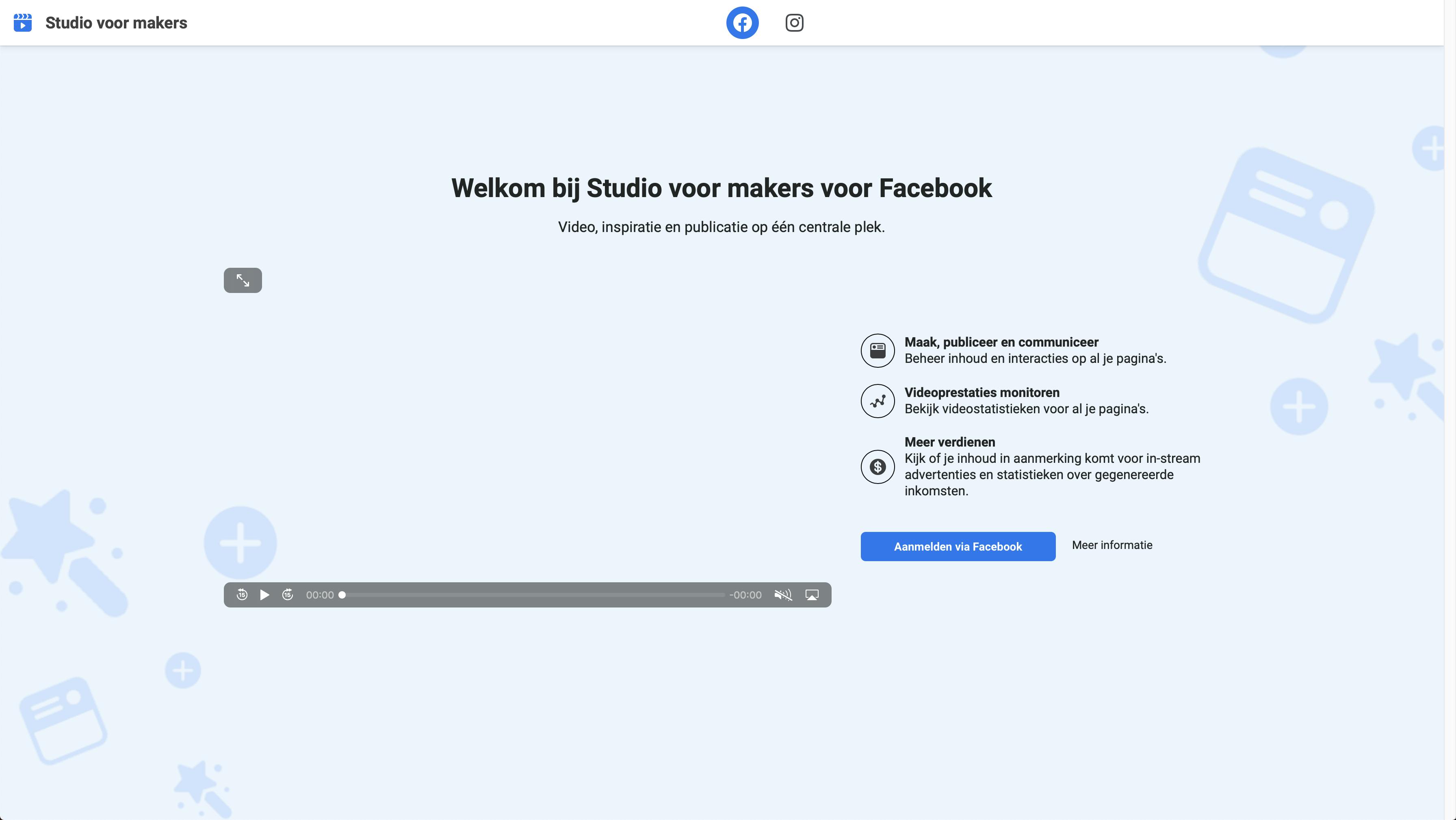 De centrale plek waar je berichten voor zowel Facebook als Instagram kunt inplannen, heet Studio voor makers. Je vindt de studio op www.tiny.cc/crestu, klik op Aanmelden via Facebook en je belandt bij het dashboard van waaruit je berichten kunt plaatsen of inplannen.