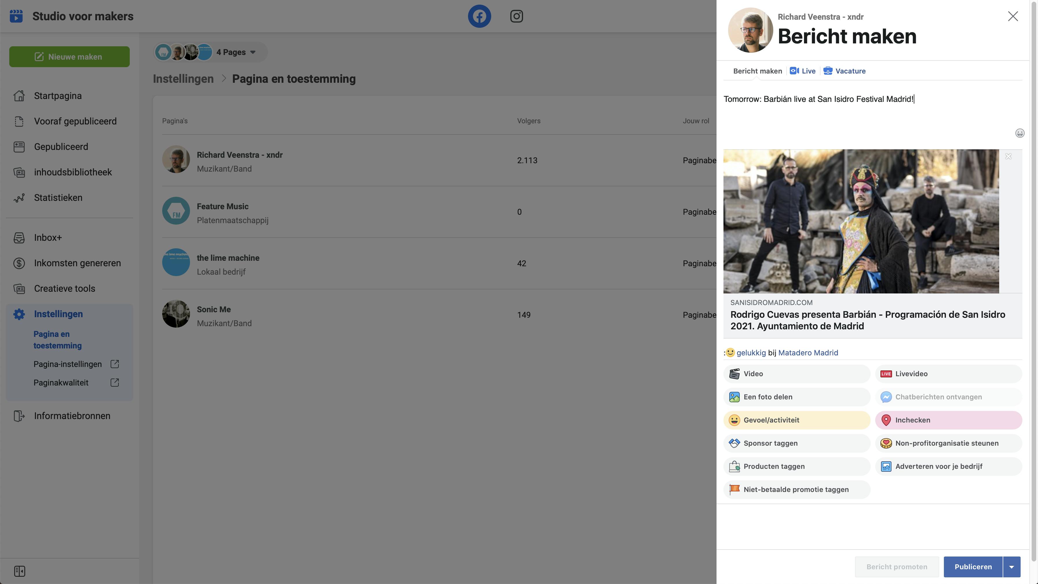 Op deze instellingenpagina zie je meteen hoeveel volgers je pagina heeft. Klik op de naam van de pagina om de pagina te bekijken. Je kunt met Studio voor makers meerdere Facebook-pagina’s tegelijkertijd beheren, deze worden hier allemaal weergegeven.