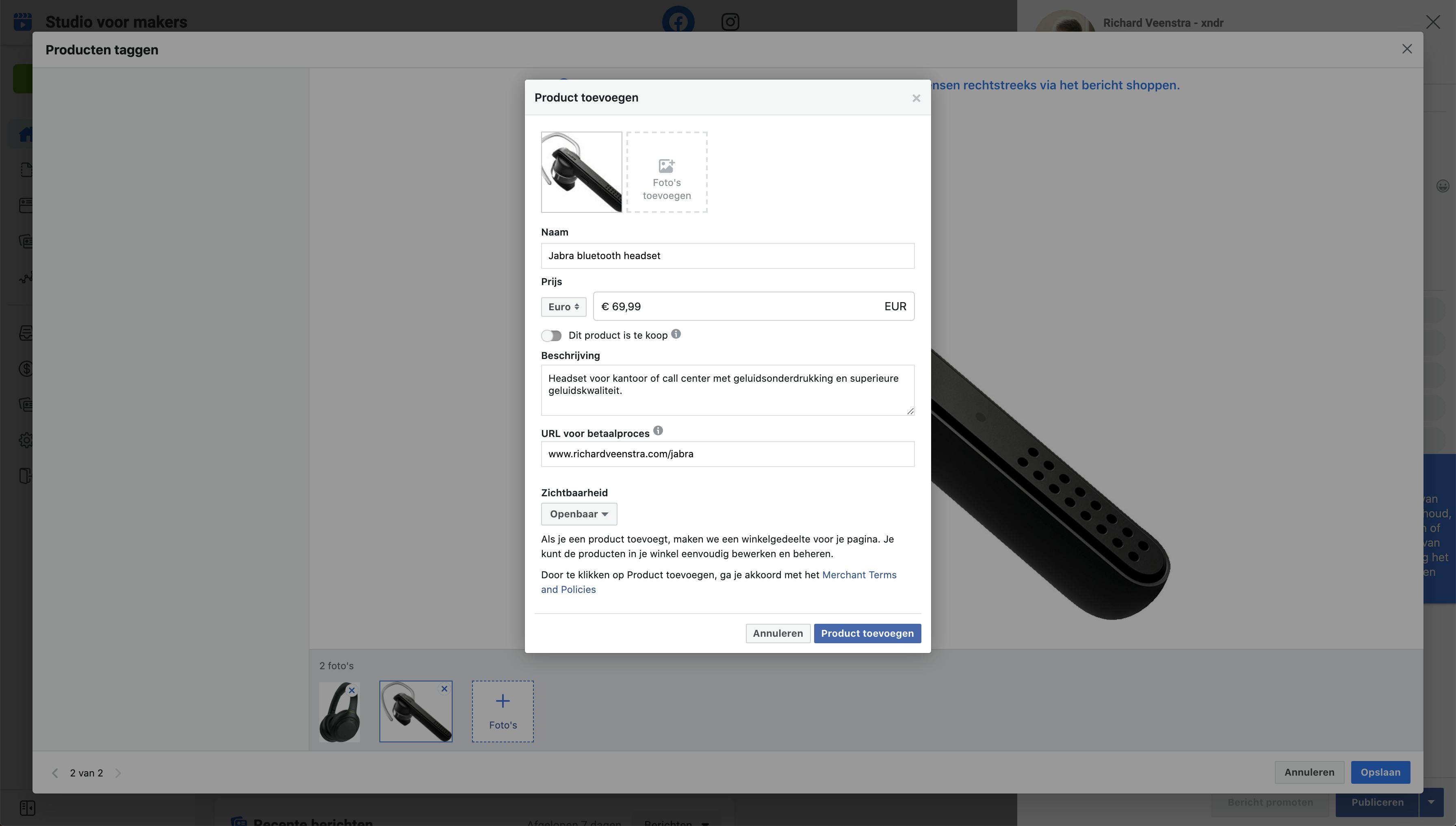 Klik op Producten taggen en kies voor Upload Files om foto’s van producten toe te voegen, je kunt meerdere tegelijkertijd selecteren. Klik onderin op een van de foto’s en vervolgens ergens op de foto, kies voor Product toevoegen en in het pop-upscherm voer je alle informatie in, inclusief een url naar het product op je website. Klik op Product toevoegen en vervolgens op Opslaan.