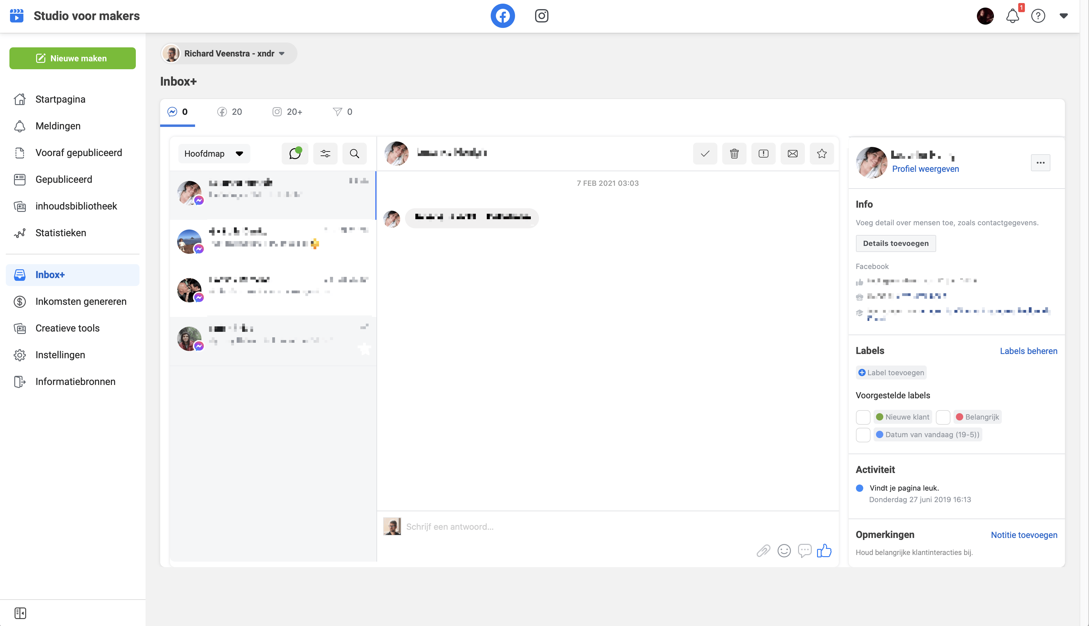 Je kunt Studio voor makers ook gebruiken om te reageren op privéberichten op al je pagina’s. Klik links op Inbox+ en kies bovenin de inbox van de pagina die je wilt openen. Klik op een conversatie aan de linkerkant en reageer op het bericht in het veld in het midden.