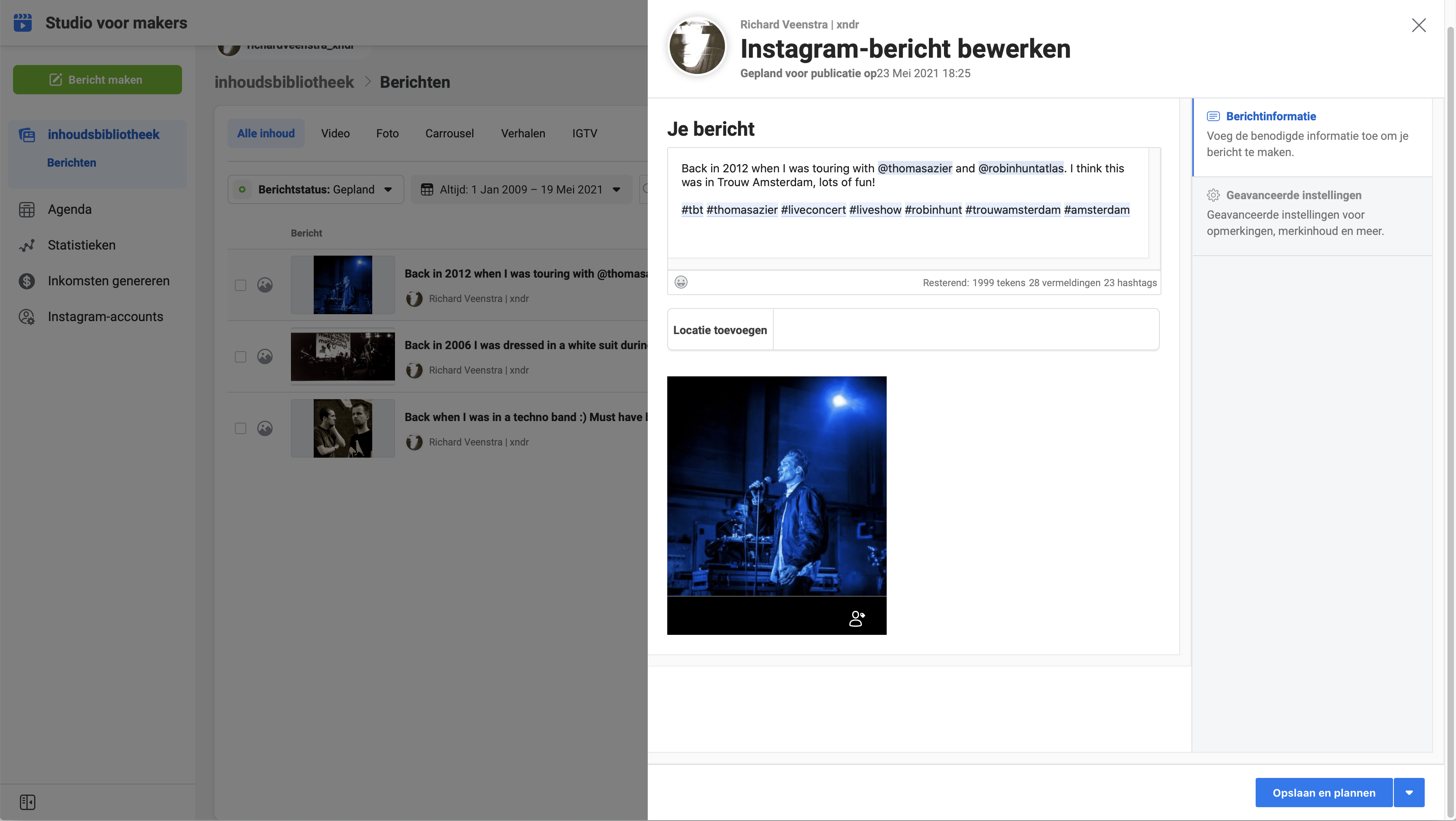Klik achter Berichtstatus voor Gepland. Om een ingepland bericht te veranderen, ga je er met je muis overheen tot er drie stipjes verschijnen. Klik erop en kies voor Bewerken. Pas het bericht eventueel aan of verander de ingeplande datum en kies voor Opslaan en plannen.