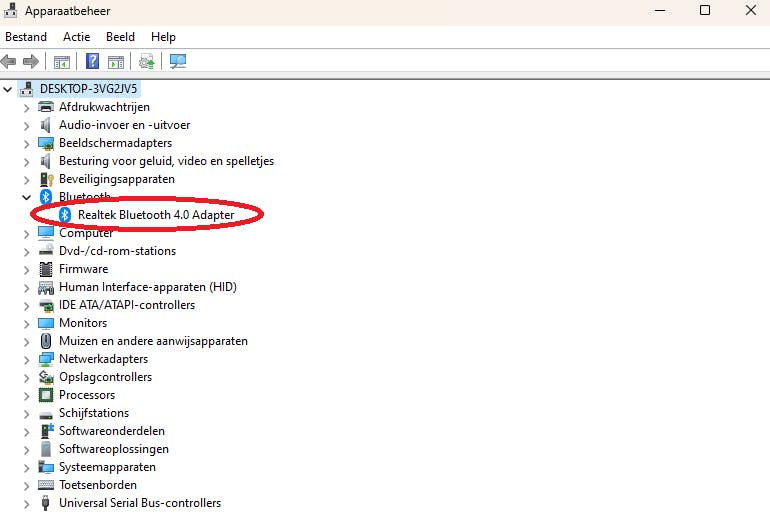 Weet je niet welke bluetoothversie je hebt? Ga dan via het startmenu naar Apparaatbeheer en klik op het pijltje naast Bluetooth. In het onderstaande voorbeeld zie je bijvoorbeeld dat de betreffende pc een bluetooth 4.0-adapter heeft. In dit geval kan het dus lonen om over te schakelen naar 5.0 of nieuwer.