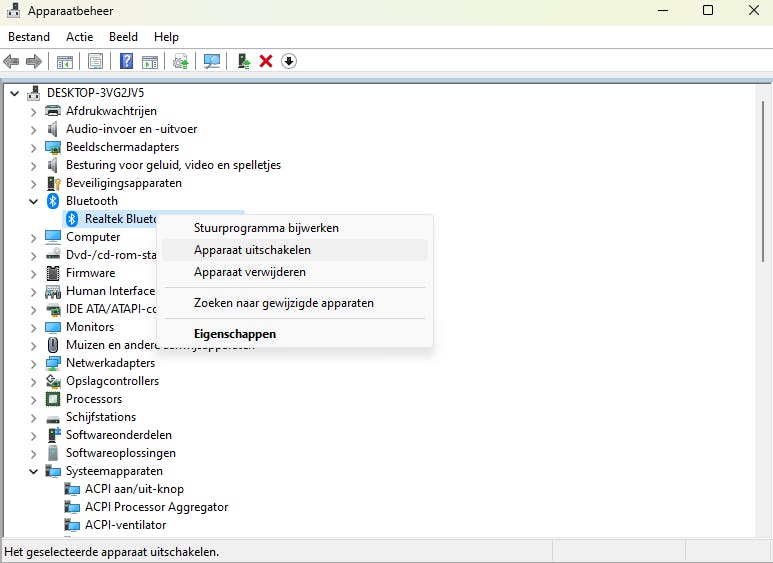 Ga naar Apparaatbeheer en klik opnieuw op het pijltje naast Bluetooth. Klik met de rechtermuisknop op de adapter en kies voor Apparaat uitschakelen. Kies hier niet voor Apparaat verwijderen, want dat kan ervoor zorgen dat Windows de adapter weer opnieuw herkent en gaat installeren. Door de adapter uit te schakelen wordt het ook makkelijker om deze later weer te installeren als dat nodig is, bijvoorbeeld omdat je je dongle bent vergeten.