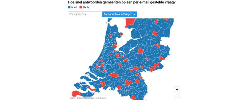 14 procent van de gemeenten was te laat met antwoorden. Een klein deel daarvan maakte het wel erg bont. Want zeven gemeenten lieten helemaal niks van zich terughoren, ook niet na een tweede poging. Dit terwijl er vanuit de overheid wel een 'gedragslijn' is om binnen twee dagen te antwoorden, tenzij het om complexe zaken gaat. Dan geldt een maximale antwoordtijd van tien dagen.