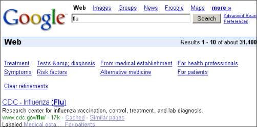 U kunt al een eerste blik werpen op de nieuwe dienst van Google. Wanneer u ‘tired’ of ‘flu’ intypt op http://64.233.167.99 krijgt u links te zien naar ‘treatment’, ‘symptoms’ en ‘risk factors’.