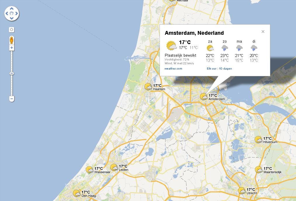 Google heeft Google Maps uitgebreid door een weerbericht toe te voegen. Het weerbericht toont de weersomstandigheden van plaatsen over de hele wereld.