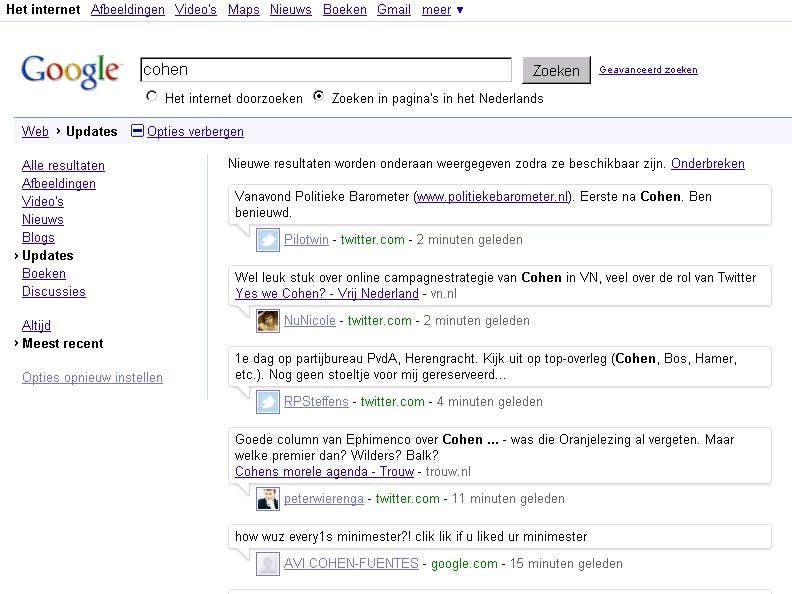 Vanaf vandaag komt Google's real-time search overal ter wereld beschikbaar. Dit betekent dat deze functionaliteit, die sinds december al in gebruik is bij de Engelstalige Google-sites, in de komende dagen ook wordt toegevoegd aan de Nederlandse versie van Google.