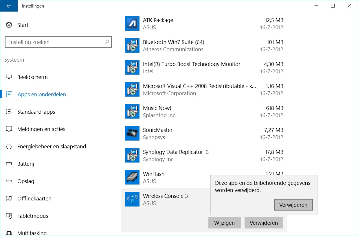 Zodra je een nieuwe computer of laptop koopt, staan daar meestal allerlei voorgeïnstalleerde applicaties op. Tot overmaat van ramp starten die ook nog eens vaak gelijktijdig met Windows op, waardoor je pc extra rekenwerk moet verzetten. Denk hierbij bijvoorbeeld aan (een proefversie van) een virusscanner, brandprogramma, toolbar of hulptool voor energiebeheer. Deze ongevraagde rommel noemt men ook wel bloatware. In de praktijk blijven dergelijke programma’s nog jarenlang op de computer rondzwerven. In Windows 10 zie je eenvoudig welke programma’s je zelf niet hebt toegevoegd en die je misschien wel wilt wissen. Open via het Startmenu het onderdeel Instellingen. Ga naar Systeem / Apps en onderdelen en kies voor Sorteren op installatiedatum. De programma’s die het langst op je pc aanwezig zijn, vind je helemaal onderaan. Selecteer een programma dat je wilt wissen en kies tweemaal voor Verwijderen. Wis overigens alleen toepassingen waarvan je de betekenis kent.