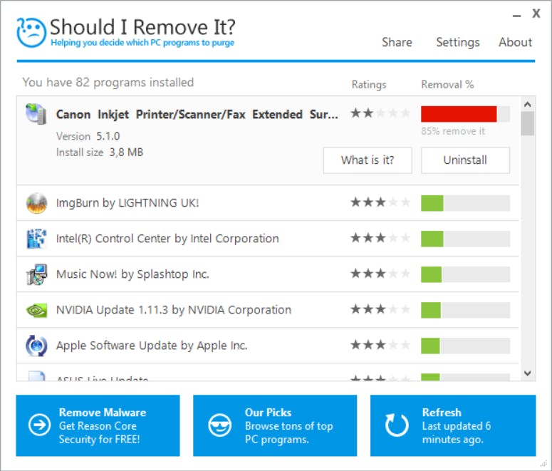 Soms is het lastig inschatten in hoeverre je met overbodige bloatware te maken hebt. Voor hetzelfde geld wis je bijvoorbeeld een belangrijke driver, waardoor bepaalde hardware wellicht niet meer functioneert. Het is dan ook belangrijk om te weten of je het programma zorgeloos kunt wissen. Het gratis programma Should I Remove It? (de naam zegt het al!) geeft antwoord op dergelijke vraagstukken. Je downloadt het programma hier. Inmiddels is de tool helaas onderdeel geworden van Reason Antivirus, hetgeen betaalde software is voor zakelijke gebruikers. Als je goed zoekt, vind je Should I Remove It? echter nog via onofficiële sites. Zo kun je via deze link de tool downloaden.