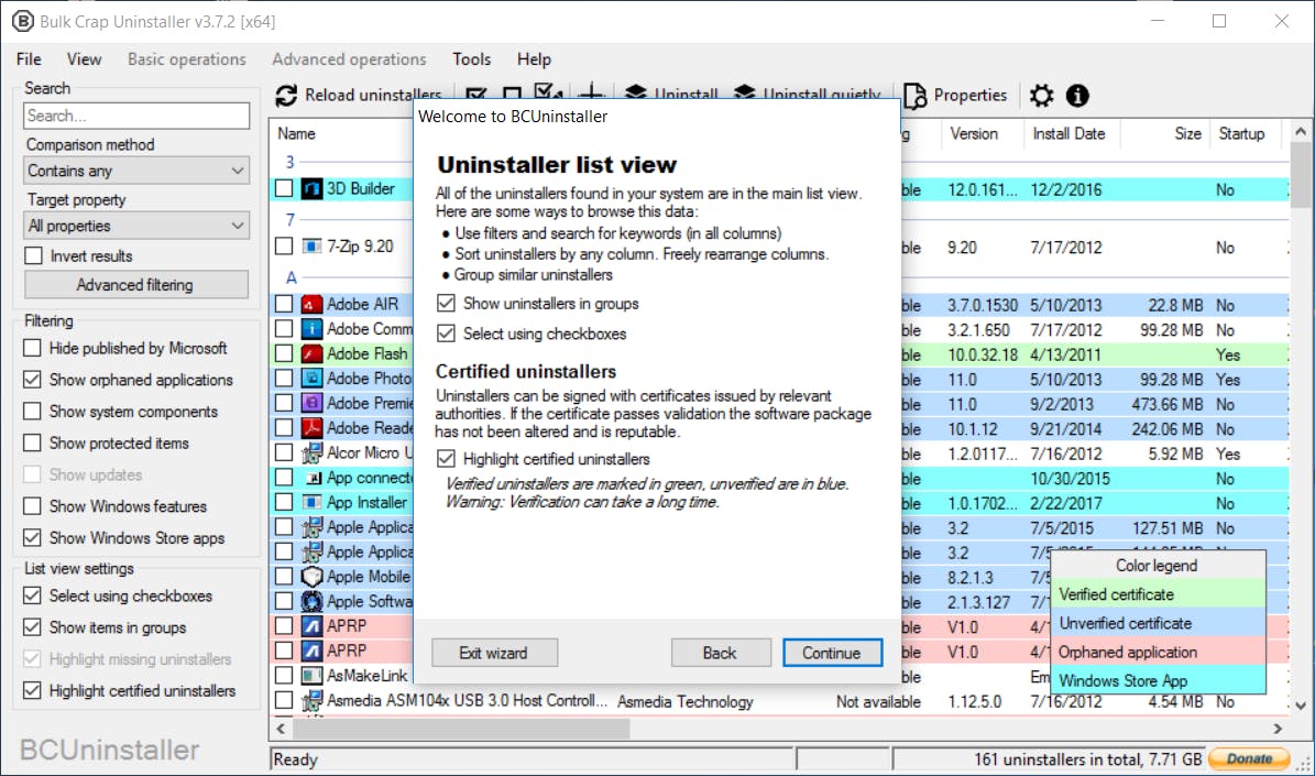 Als je veel grote programma’s wilt wissen, is dat een behoorlijk tijdrovende klus. Bovendien blijven er op de systeemschijf en in het register vaak nog allerlei resten achter. Het programma BCUinstaller kan meerdere applicaties tegelijk wissen en controleert naderhand of ook alle restanten zijn verdwenen. Surf hiernaartoe om het programma te downloaden. Je hebt keuze uit een standaardinstallatie en portable versie. Laatstgenoemde optie is bijvoorbeeld handig voor gebruik op een usb-stick. Voor de werking maakt het in ieder geval niet uit. Maak een keuze en klik op Next. Nadat je de licentievoorwaarden hebt geaccepteerd, neem je de resterende stappen door. Start BCUinstaller vervolgens op. Er verschijnt een introductiewizard in beeld. Standaard is de voertaal Engels, maar eventueel kun je ook een andere wereldtaal selecteren. Kies voor Continue en zet in de volgende stap een vinkje voor Select using checkboxes, zodat je in de volgende stap meerdere programma’s kunt selecteren. In de resterende stappen hoef je niets te wijzigen. Druk telkens op Continue en sluit het dialoogvenster met Finish setup.