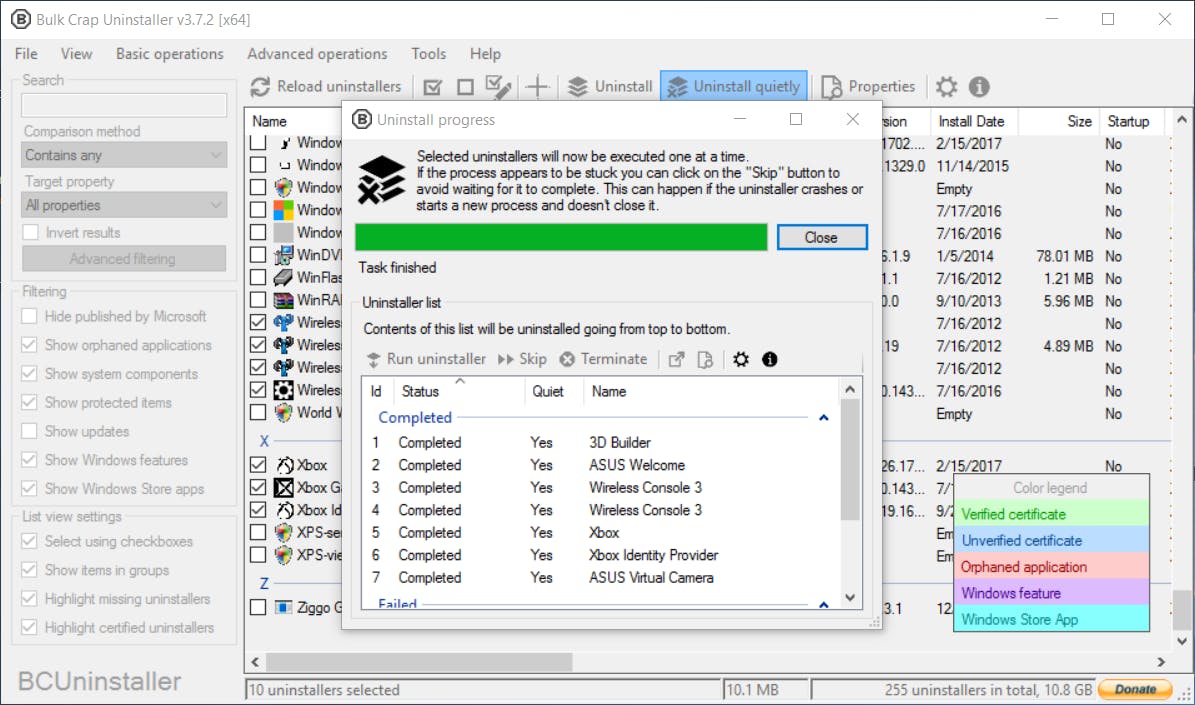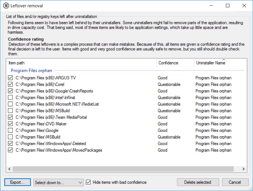 BCUinstaller toont een lijst van alle geïnstalleerde toepassingen. Zo zijn bijvoorbeeld de standaard-apps van Windows 10 in het overzicht beschikbaar, waaronder 3D Builder, Films & TV en Xbox. Door aan de linkerkant de opties Show protected items en Show Windows features te selecteren, verschijnen er nog meer programma’s en onderdelen in het overzicht. Aan jou de taak om alle ongewenste programma’s aan te vinken. Hierbij geldt wel dat je alleen de applicaties aanwijst waarvan je de betekenis kent. Zoek dus zo nodig even naar informatie via Google mocht je een onbekend programma op de korrel hebben. Nadat je alles hebt geselecteerd, kies je bovenaan voor Uninstall quietly. Je krijgt eerst het verzoek om een herstelpunt aan te maken, dus zorg daar zo nodig voor. Meestal voert BCUinstaller het deïnstallatieproces volautomatisch uit. Is dat bij jou niet het geval? Het opschoonprogramma laat dan een overzicht zien met programma’s die nog niet volledig zijn gewist. Verder vraagt BCUinstaller of het op zoek moet gaan naar restanten van verwijderde programma’s. Bevestig hierbij met Yes. Gevonden restanten verwijder je met Delete selected definitief van het systeem.
