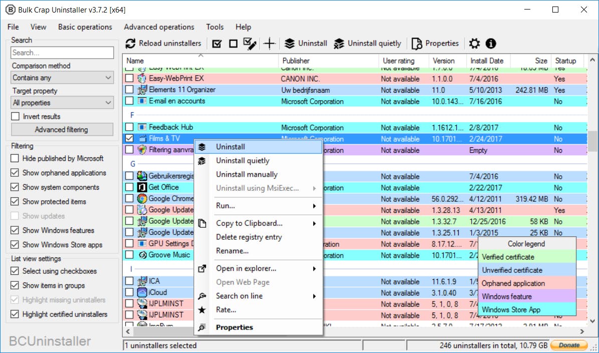 Als het niet lukt om een applicatie automatisch te wissen, zit er niets ander op dan de boel handmatig te verwijderen. Aangezien de systeeminstellingen van Windows 10 lang niet alle geïnstalleerde programma’s weergeven, ben je voor dit klusje beter af met BCUinstaller. Klik met de rechtermuisknop op de naam van een programma en kies voor Uninstall. Je krijgt wederom het verzoek om een herstelpunt aan te maken. Maak een keuze en probeer het softwarepakket te verwijderen van het systeem. Via Yes zoekt BCUinstaller desgewenst nog naar restanten.