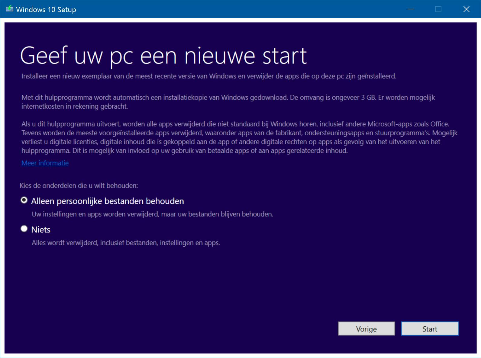 Heb je een nieuwe pc of laptop aangeschaft, maar vind je al die voorgeïnstalleerde rommel maar niets? Gebruik dan de nieuwe Windows Refresh Tool. Hiermee ververs je de machine met Windows 10 inclusief alle updates. Applicaties die Microsoft niet standaard met Windows 10 meelevert, verwijder je met dit hulpprogramma snel en eenvoudig. Verder heb je wel de mogelijkheid om je persoonlijke bestanden te behouden. Surf hiernaartoe en klik onderaan op Download hulpprogramma nu. Start het programma daarna via RefreshWindowsTool.exe. Nadat je akkoord gaat met de licentievoorwaarden, bepaal je in het volgende scherm of je persoonlijke bestanden wilt behouden. Bevestig tot slot met Start om Windows 10 definitief te verversen.